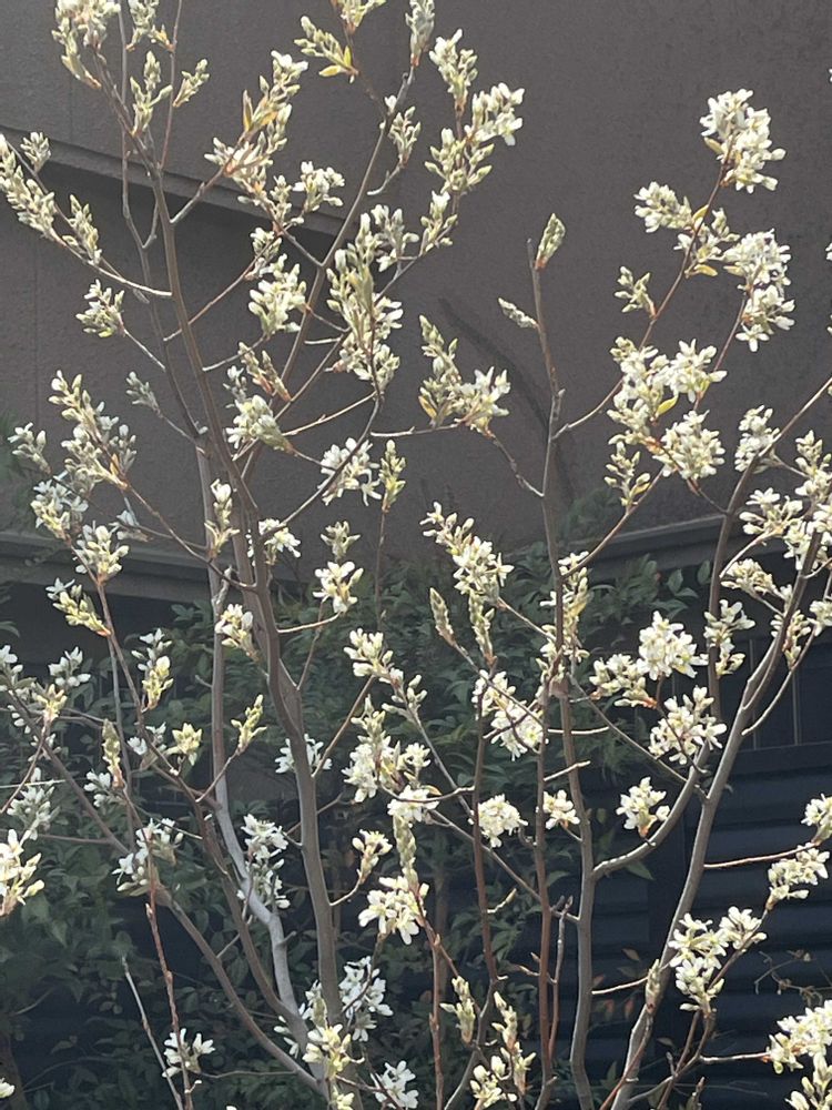ジューンベリーにたくさん白い花がついています。実がたくさんつきそう。(ほとんど鳥に食べられてしまいますが)