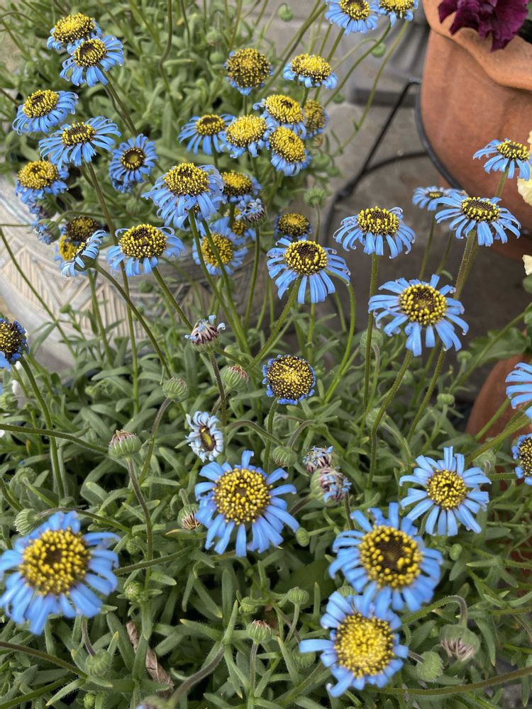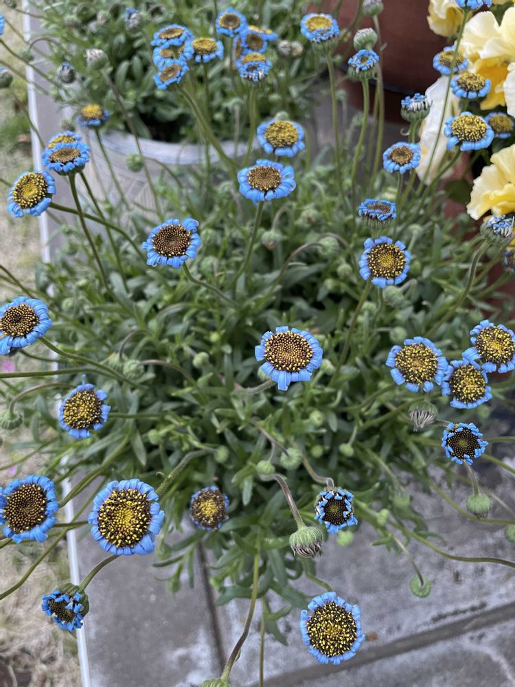 キングフィッシャーデージー きれいなブルー。今日お昼は花びらが広がっています やっと開いたお花を見られました