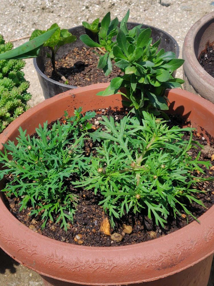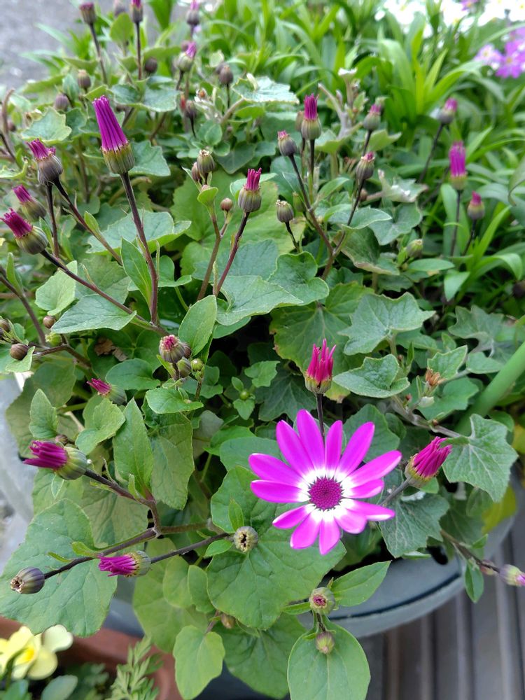 ②マーガレット、キララを寄せ植えしてから、ブラキカムをよく見ると🧐…小さな小さな蕾がついているではあ〜りませんか!