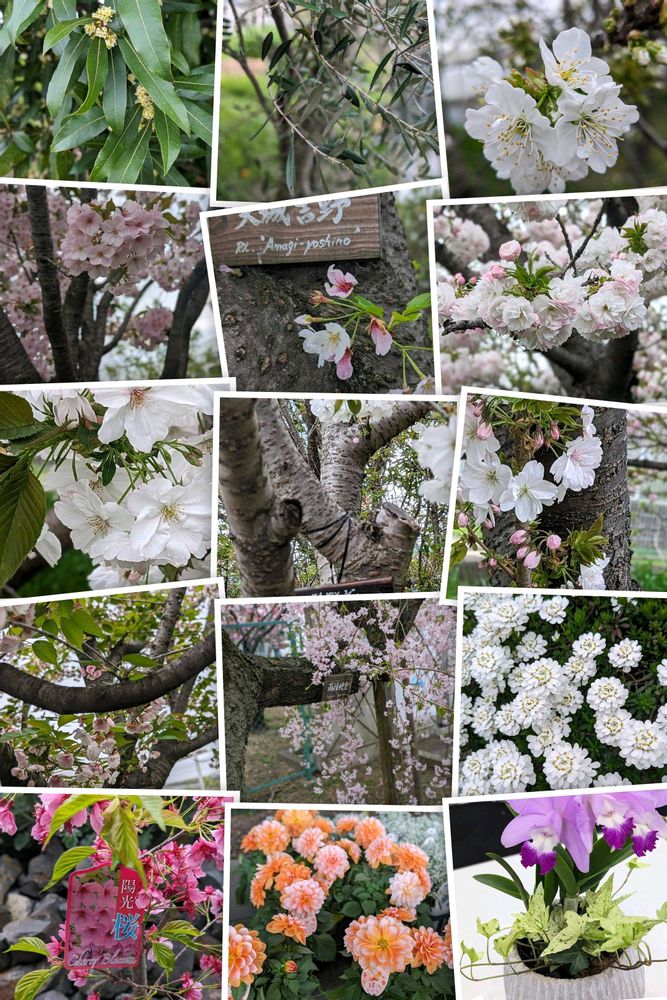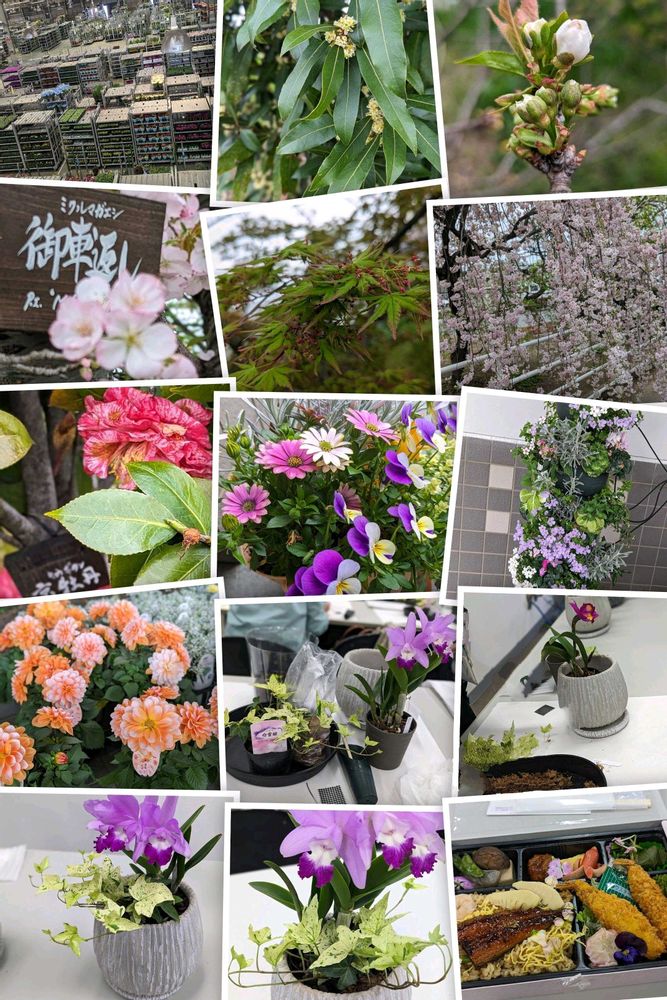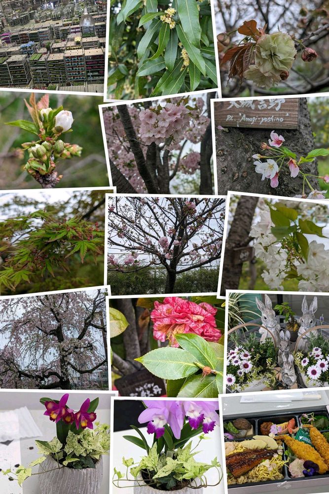 Googleフォトが「あれから1年」と題してコラージュしてくれました🍀😊✨2024年4月8日㈪🌸🌸🌸生産日本一の愛知県豊明花き市場で、セリの様子と、敷地内に植えられた桜の様々な品種🌸を見学、寄せ植えを体験、エディブルフラワー(食べられる花)を使った「花市場特製弁当」を頂きましたψ(´ڡ`♡) オイシー♪*..。o🌸°・:✿.*..。o🌸°・:❀.*..。o🌸*..。o🌸°・:✿.*