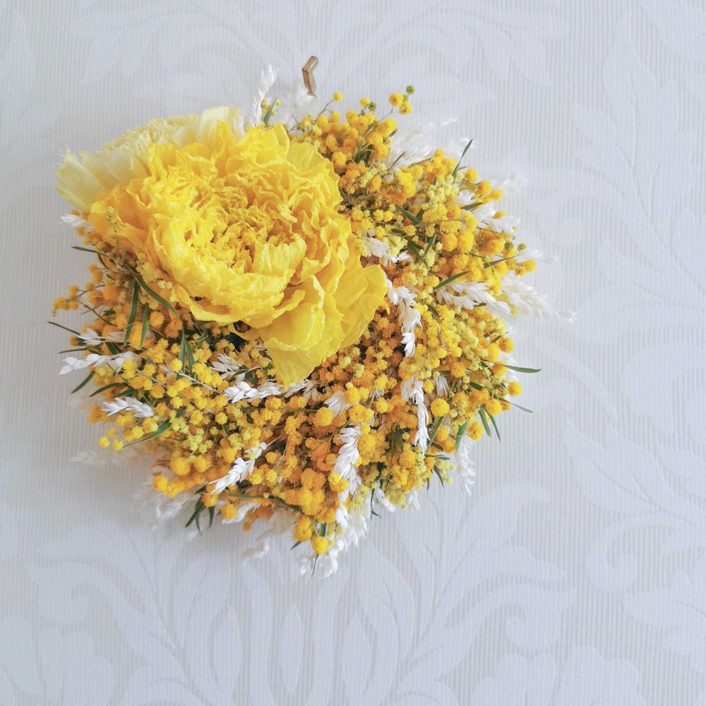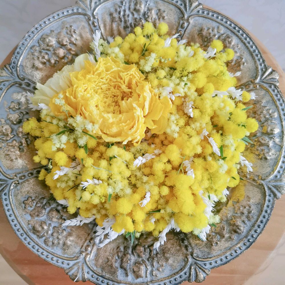 新鮮な摘みたてミモザをたっぷり重ね、グラス系のプリザーブドフラワーも一緒に作ってみました