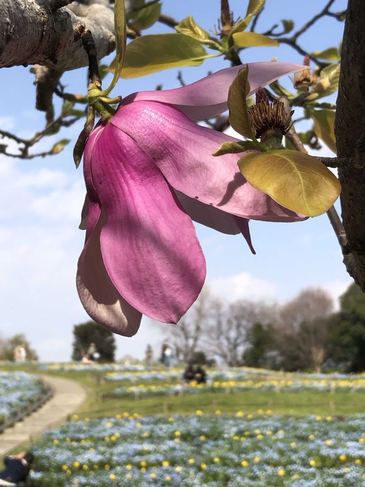 晴天💙のもと「シモクレン」の紅色❤️が映えます。😄🤗🌞✌️