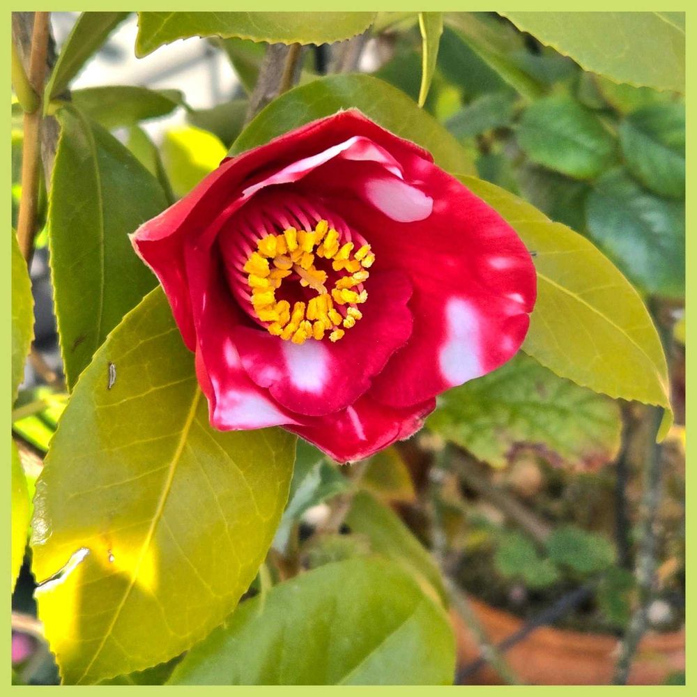 赤に白い斑が入った椿、きれいだね。
