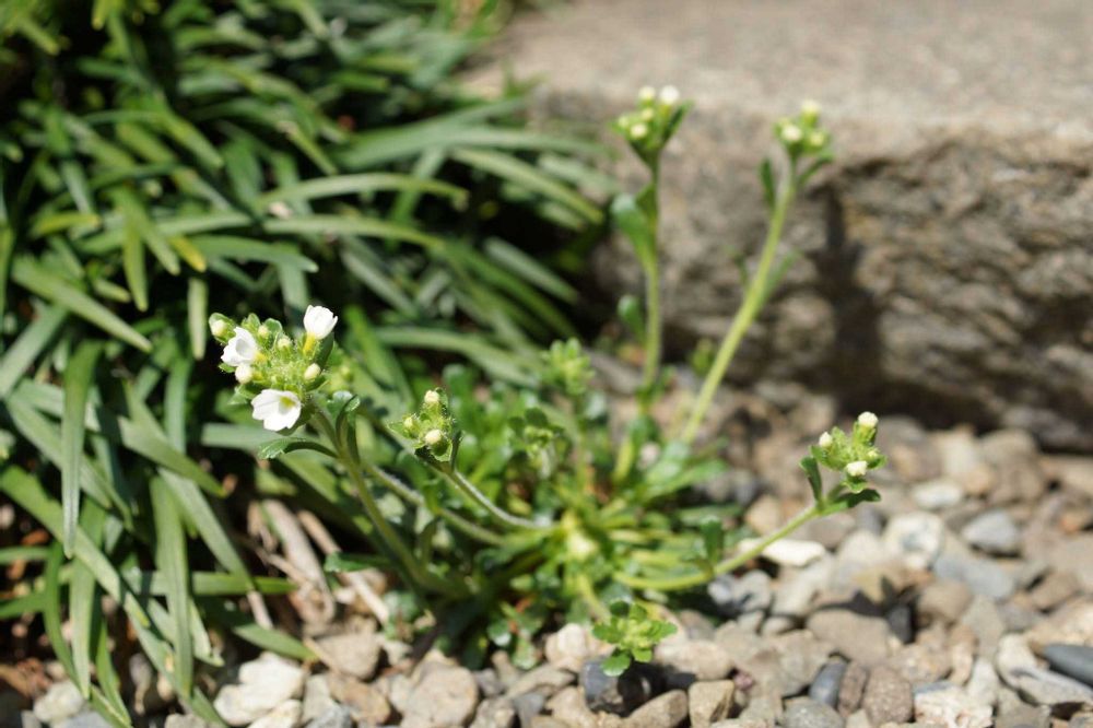 花壇から種が飛んだのでしょう。ベランダから庭に降りる踏石の際に育っています。花の直径は5mm程です。日当たりが良かったのか、花壇の岩唐草より早く咲きました😊