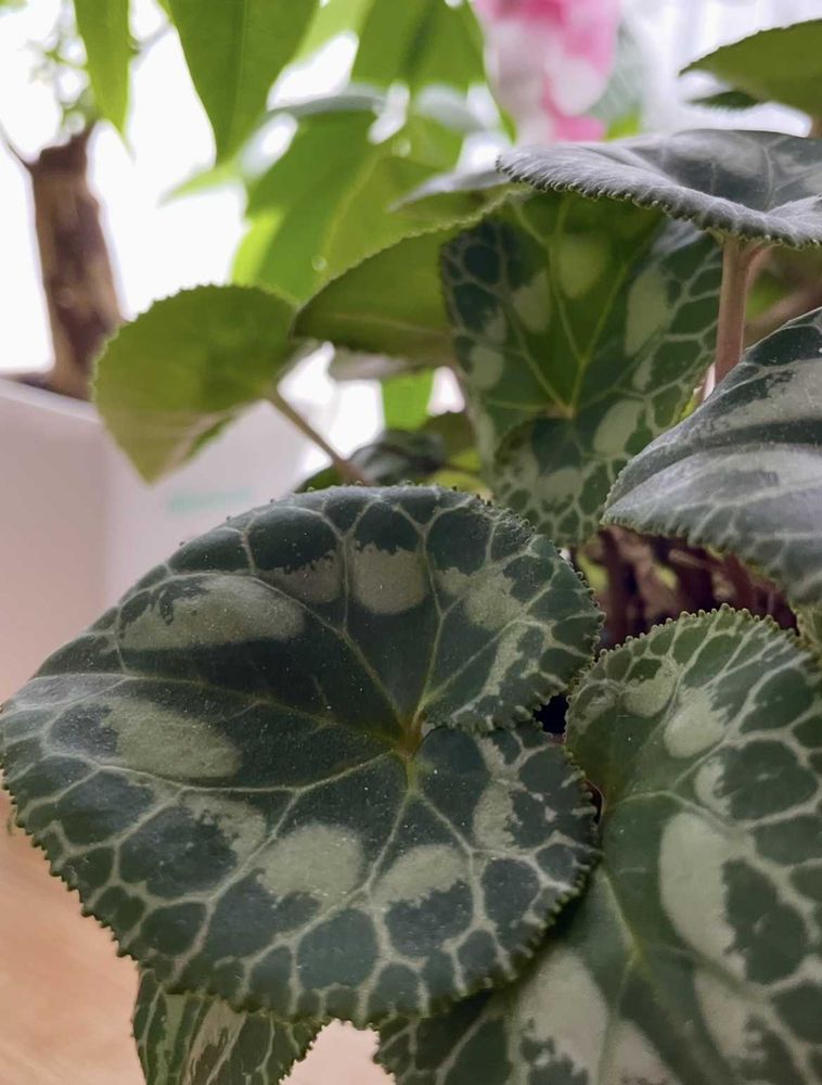 ④自宅のシクラメン 葉っぱはまだまだもりもりです💚お花も少し🌸