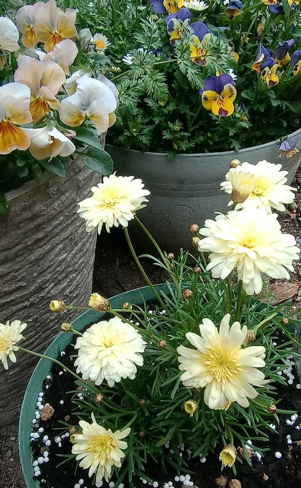 八重咲きのクリーム色のマーガレットさんも可愛いですね💕