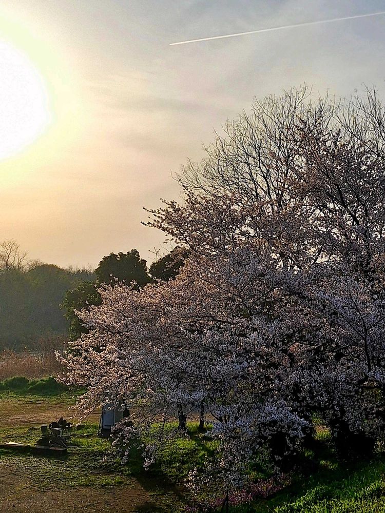 ①逆光ですが、飛行機雲と桜のコラボです🎵