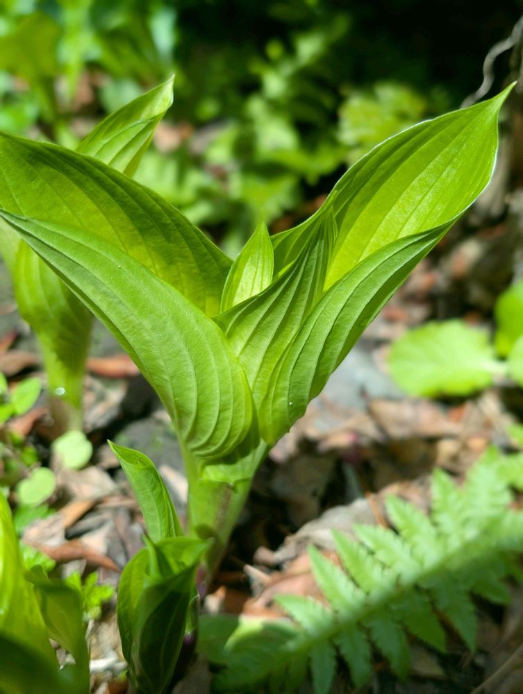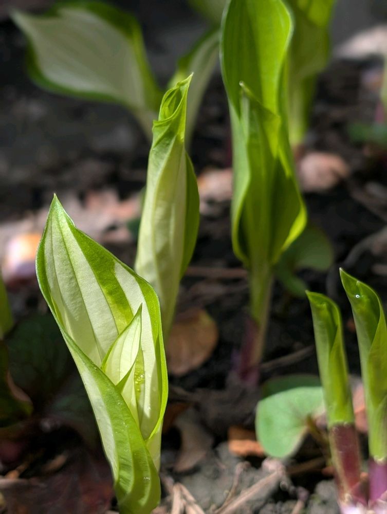 地中から球根出ちゃってるけど…綺麗な葉っぱ見せてくれてるギボウシさん…斑入りもそうでないのも綺麗です