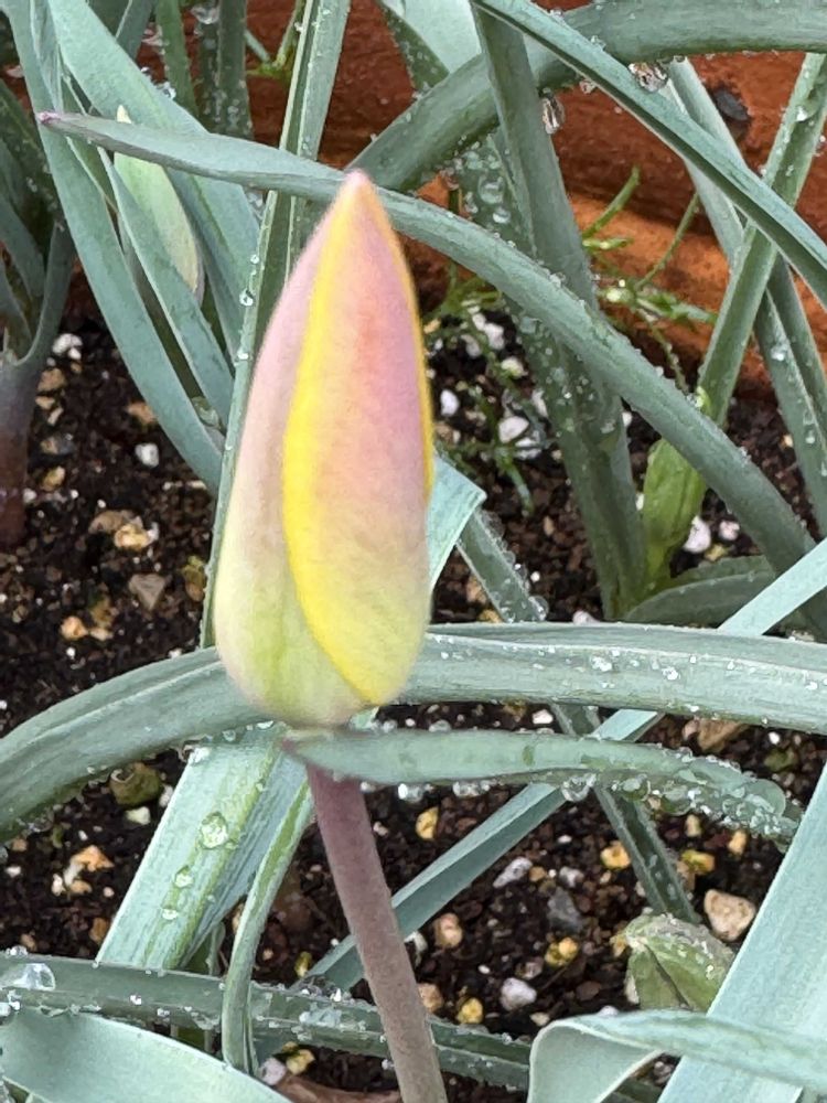 原種チューリップ🌷のツボミもこのままでもいいような姿と色合い🩷💛💚ですね❣️