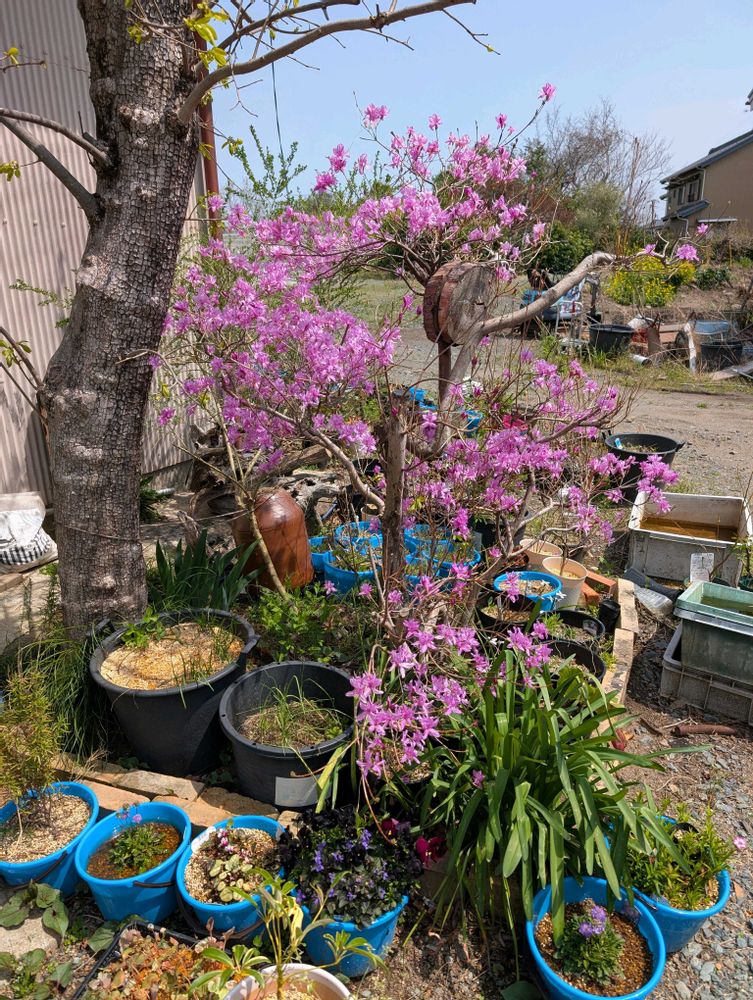 ミツバツツジは満開過ぎ〜葉が出る前に剪定すると良い天気は下り坂藪椿の抜根すると舗装が汚れるから雨の前に重機より大きいも一時間で完了!ん?根元から芽吹いた枝葉を挿し木出来ないか挑戦〜しかし太い根か出たら笑笑
