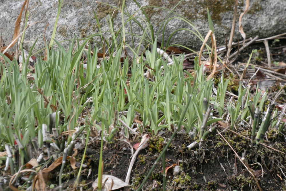 細長いつんつんした葉たちか出て来ました。これらは、「ニッコーキスゲ」の新しい葉たち。6月頃黄色い花を咲かせます。