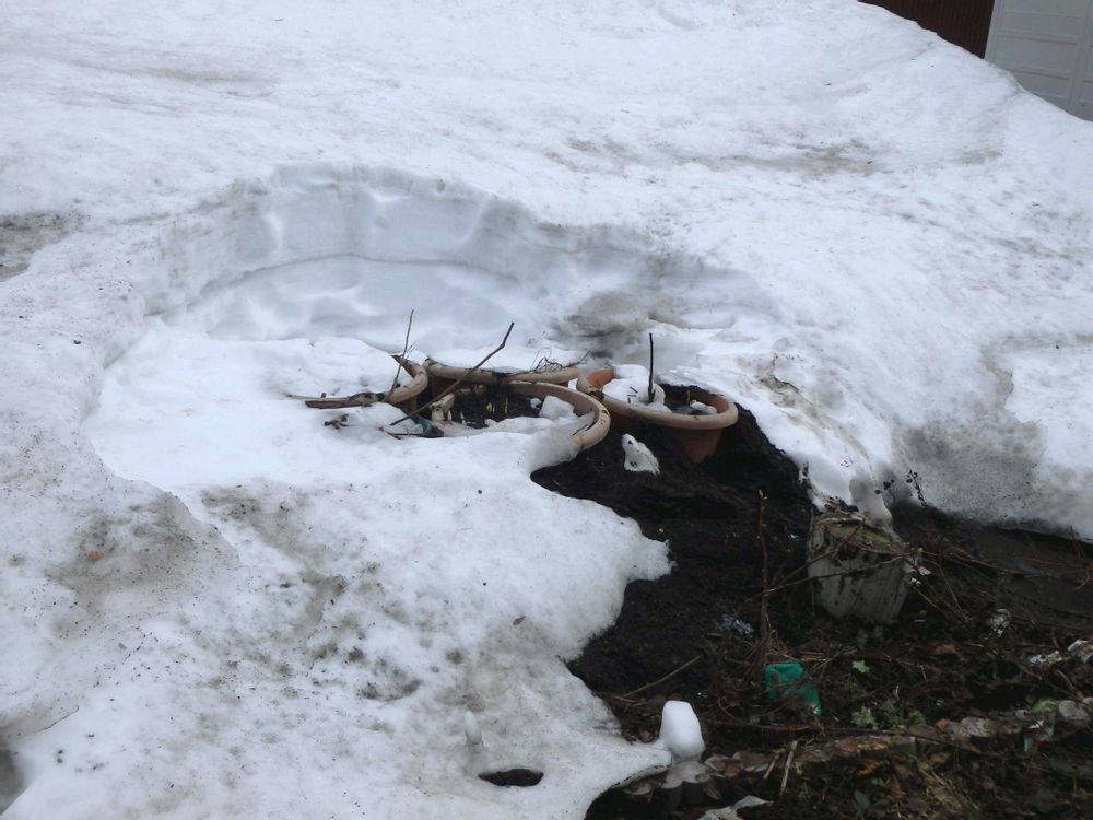 無理をすると出ている芽を傷めたりするので、このくらいにしておいて溶けるのを待ちます。もう夜もプラスだから明日には掘り出せるかな?