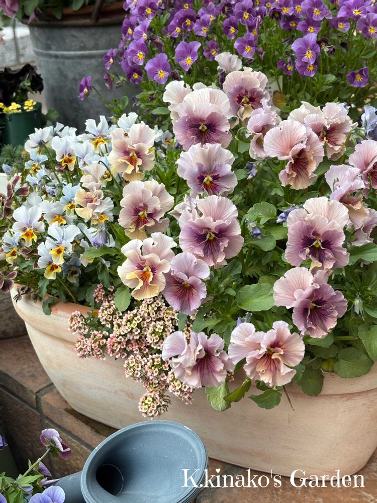 レデイが、寒い時は濃いパープルでしたが、今は淡いパープルになりました。この寄せ植え、今が一番綺麗です。