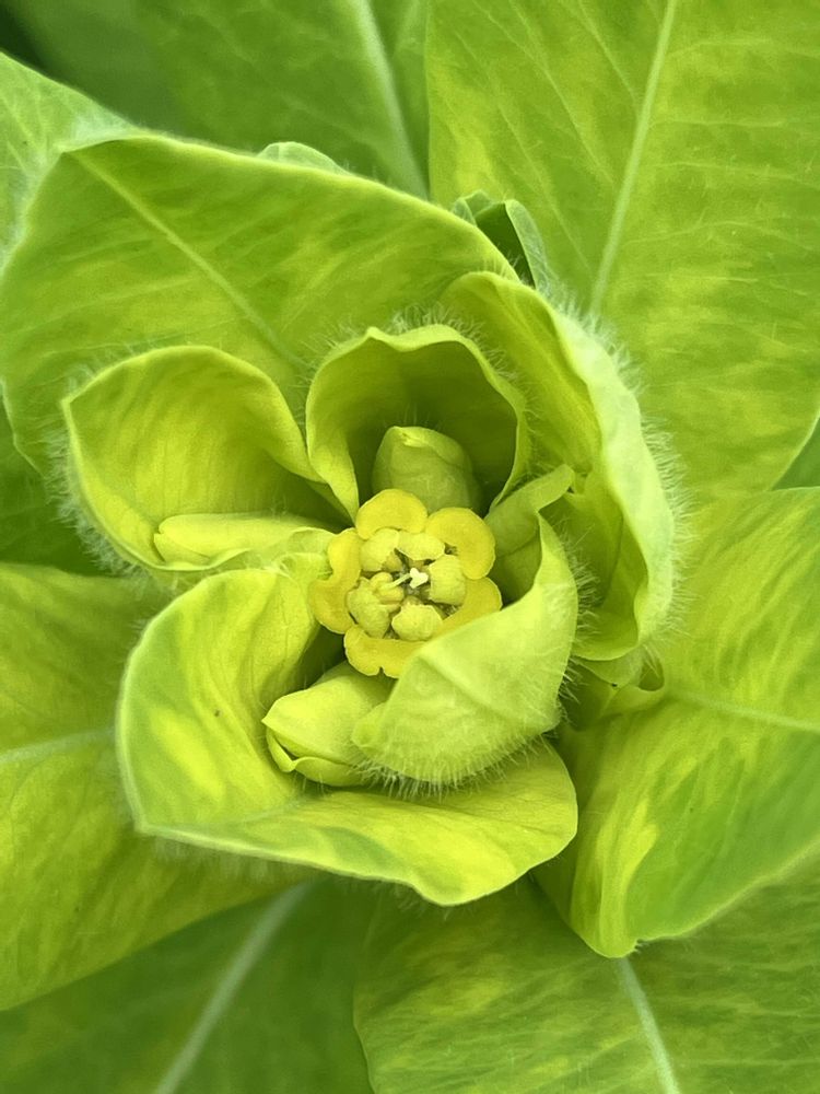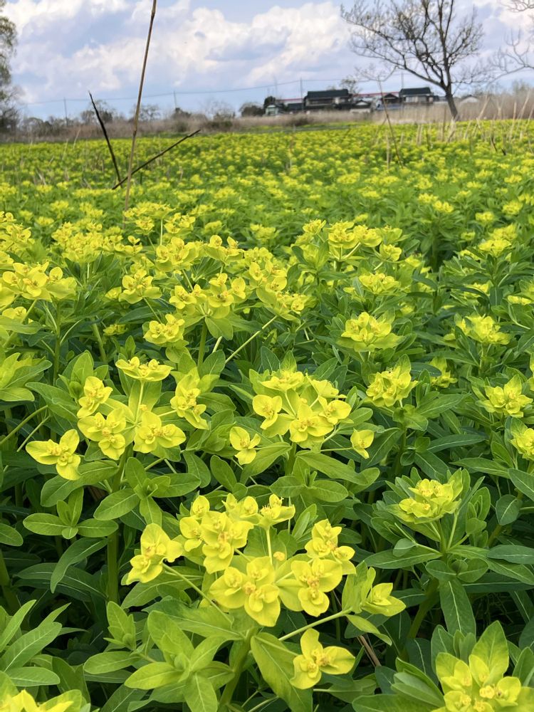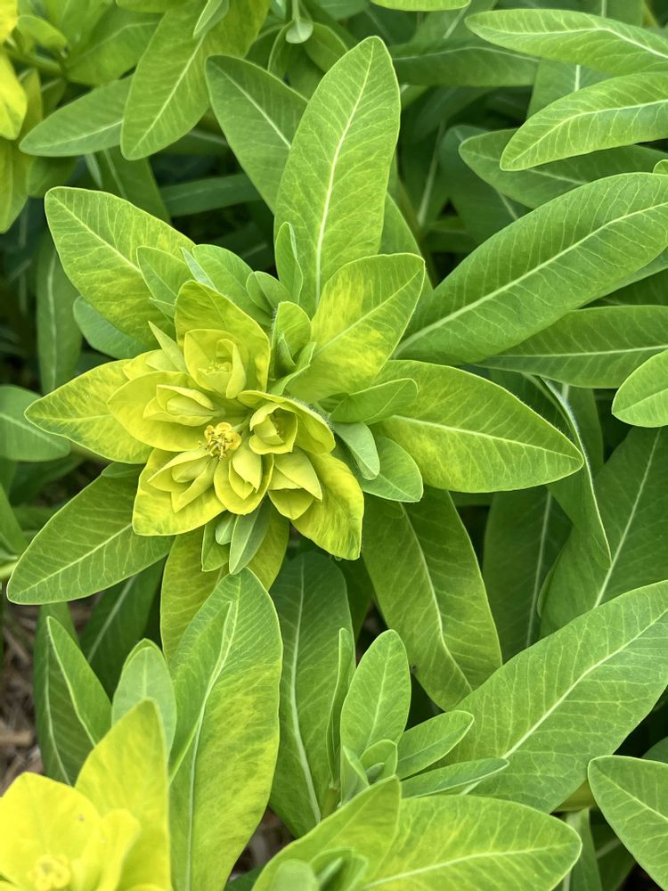 茎の先端に黄色く色づているのは、苞葉と言う葉の1種ですが、まるで黄色い花びらのように見えます