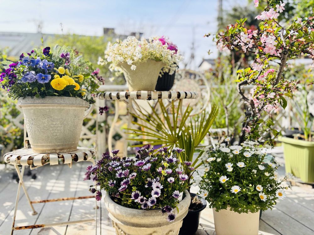 今朝のウッドデッキ🌸満開になった花たちです💐