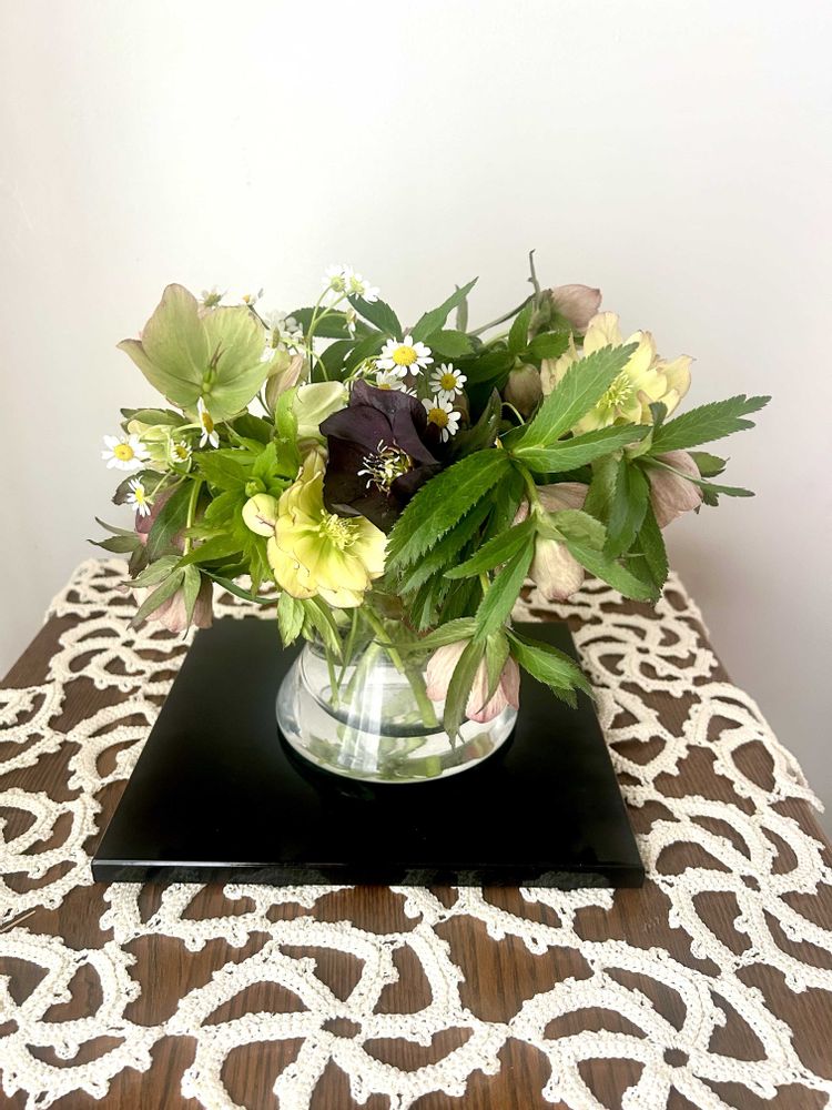 花材: クリスマスローズ(3種類)、フィーバーフュー(ナツシロギク)