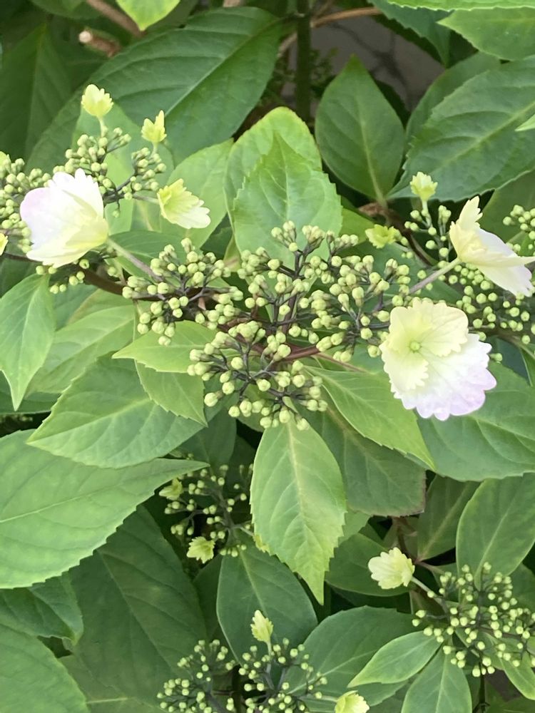ガクアジサイの花が、優しい色で素敵ですね〜