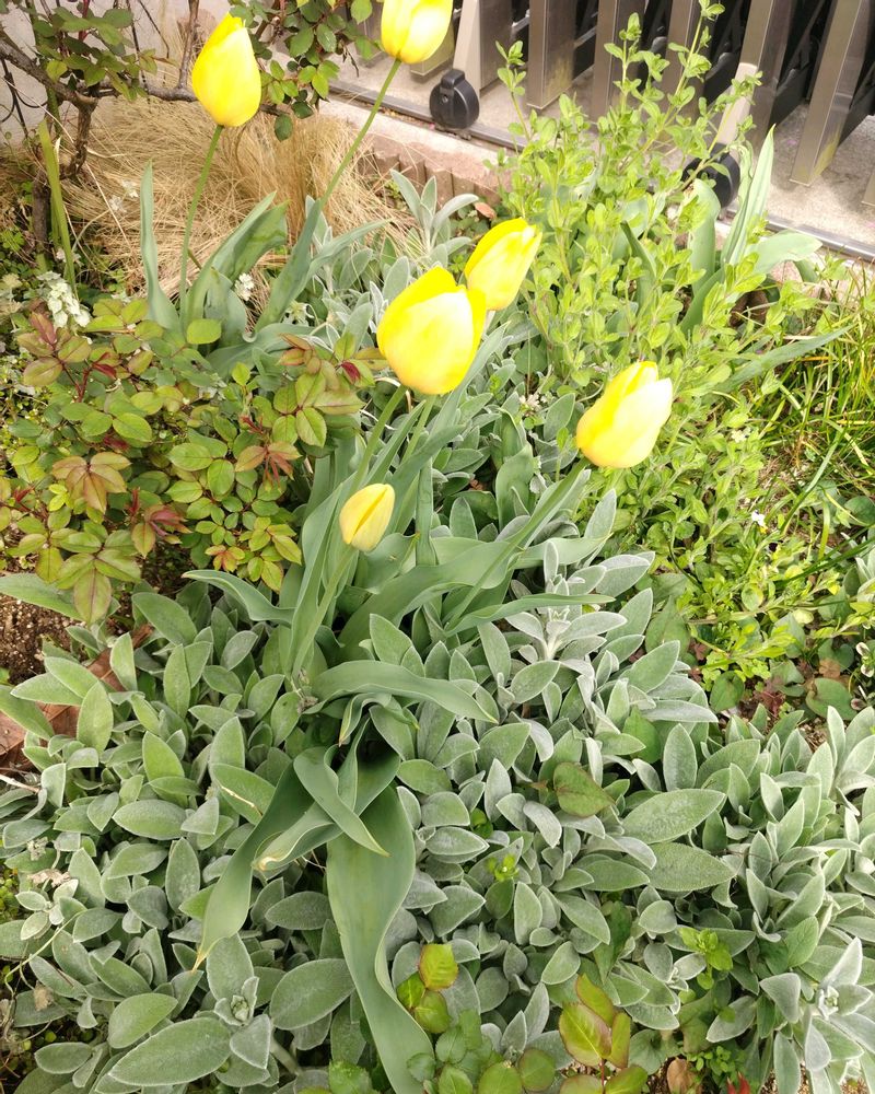 門扉前の花壇のビオラたちとこの花壇に植えたチューリップが今年も咲いてくれた。約8年は経過しているのに頑張っている。