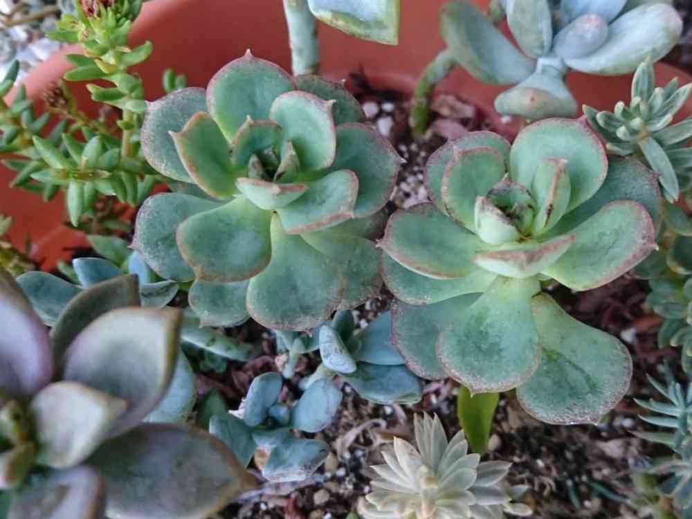 中心が焦げているのか?ハダニ被害が出ています💦ここ最近の秋の気候で、真緑色だった緑牡丹の葉の縁が少しだけ赤くなってました♪✨☺️今日はまた蒸し暑い夏日でした😵💦秋の気候になる前の週くらいに他の多肉にもハダニ被害が続出してしまいました~😢