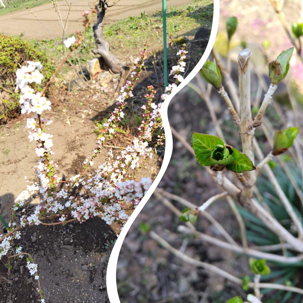 2枚め…ピンク🩷のユキヤナギ&アジサイの芽吹き🌱✨