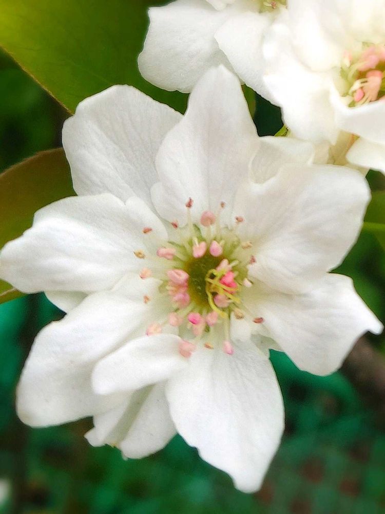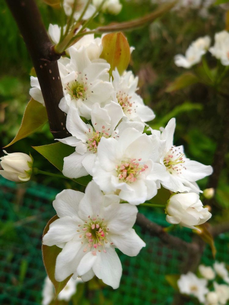 my Garden🌼4年目の梨の木🍐幸水さんの花が今年も咲きました👏✨️去年は2つ🍐🍐実をつけてくれましたが、しか〰️し😱大きくな〜れ大きくな〜れと欲をだしていたら熟し過ぎて、梨🍐ジャムのようになってしまい台無し😭💦今年は、実ったら早めに収穫するぞ〰️💪✨️楽しみだ🍐🍐🍐🍐🍐🎶