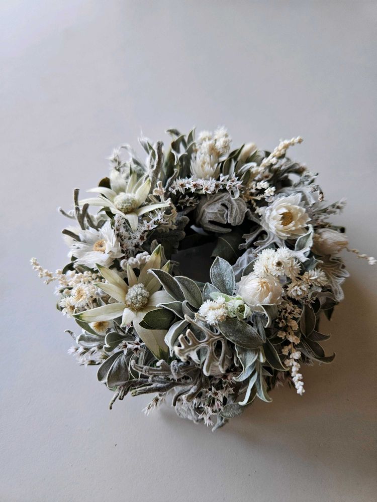 たっぷりのシルバーリーフにフランネルフラワー、ローダンセ、タタリカなどの白い小花をあしらった優しい雰囲気のミニリースです。