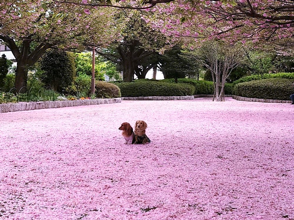 桜の絨毯🌸に可愛いワンちゃん🐶