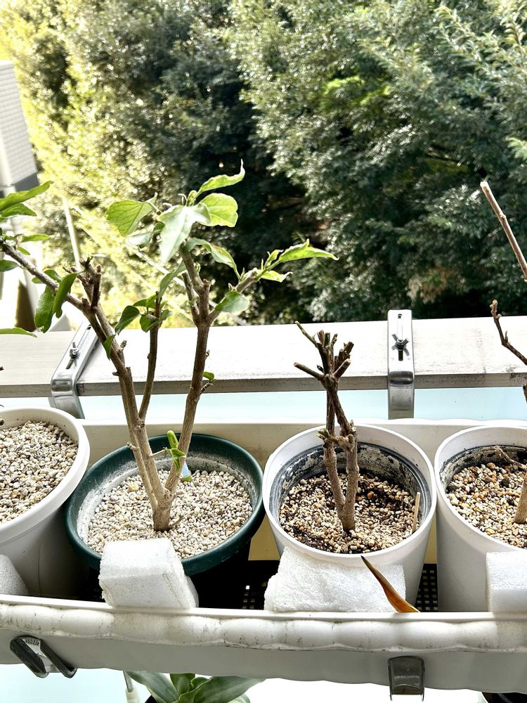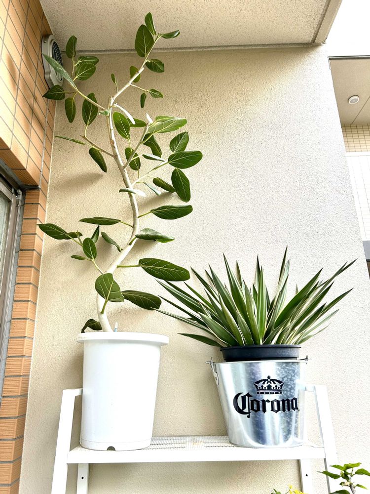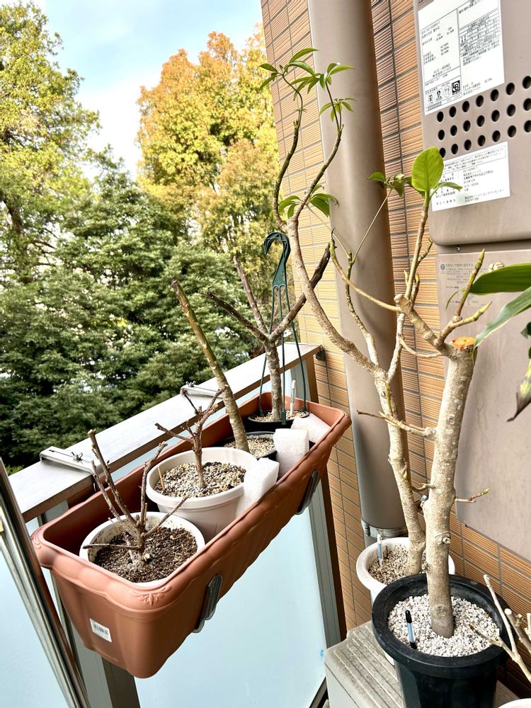 ベランダチーム😊ユッカさんは外の方が気持ちよさそうです〜😊ハイビスカス🌺さんはまだまだ先かなぁ😊冬の寒さで葉っぱが全部落ちてしまったシェフレラさん などなど😊