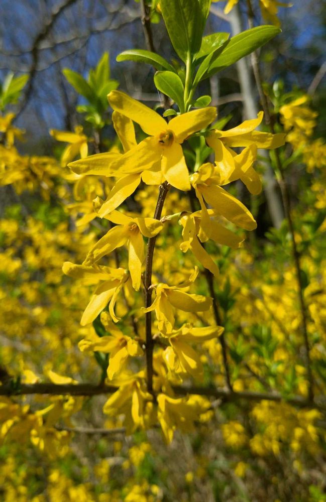 モクセイ科レンギョウ属の落葉低木。日本にはヤマトレンギョウとショウドシマレンギョウが自生するが、街中に植えられているのはほとんどが中国原産のシナレンギョウとレンギョウ、朝鮮半島原産のチョウセンレンギョウである。レンギョウの仲間は雌雄異株で、雄株の花は雄しべが大きく、雌株の花は雌しべが大きく果実が成る。花期は3~4月、葉が出る前に黄色い花が長い枝を埋めるようにつく。花は直径2.5㎝の筒形で、先が4深裂して開く。葉は長さ4~8㎝の卵形で鋸歯があり対生する。秋になると雌株の果実が褐色に熟す。