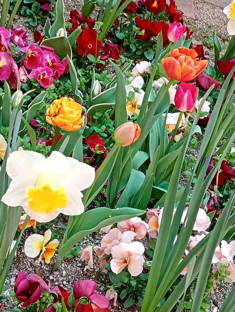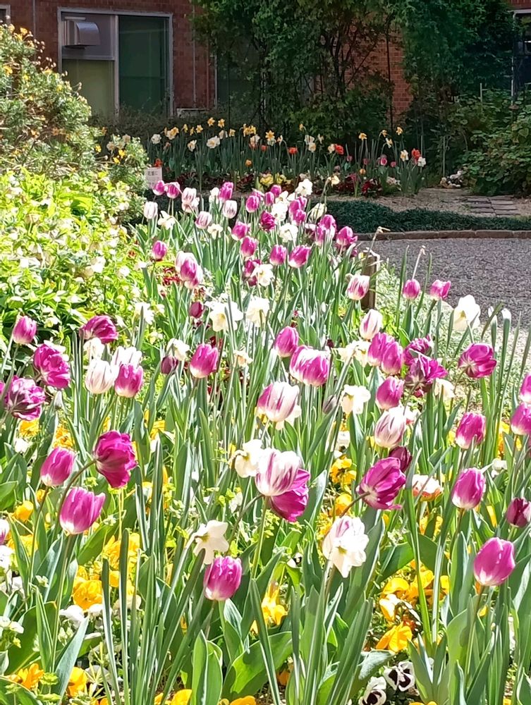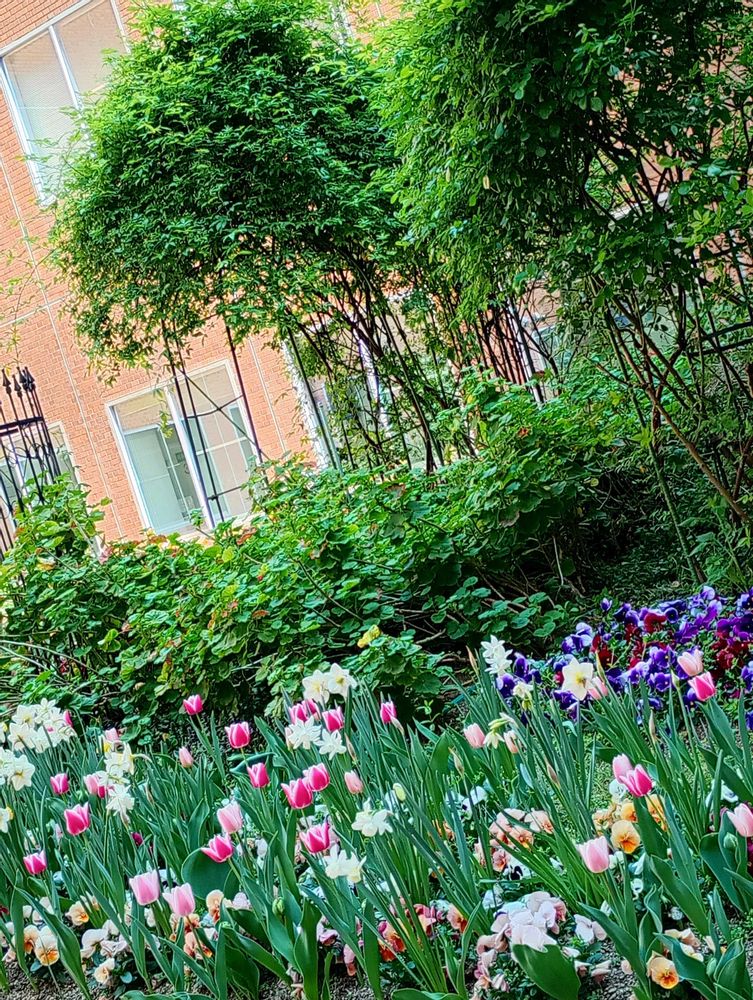 中庭は春爛漫🩷💛☘️とても豊かな色彩で、和んだりルンルン気分になったりだね🌹🌸🌼