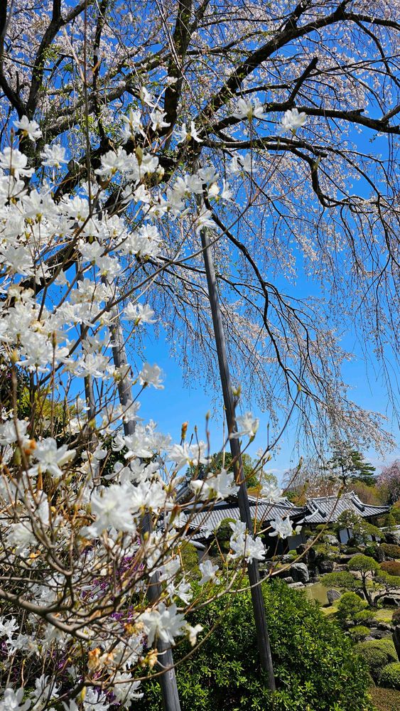これはお寺に咲いてる白いミツバツツジとシダレザクラ