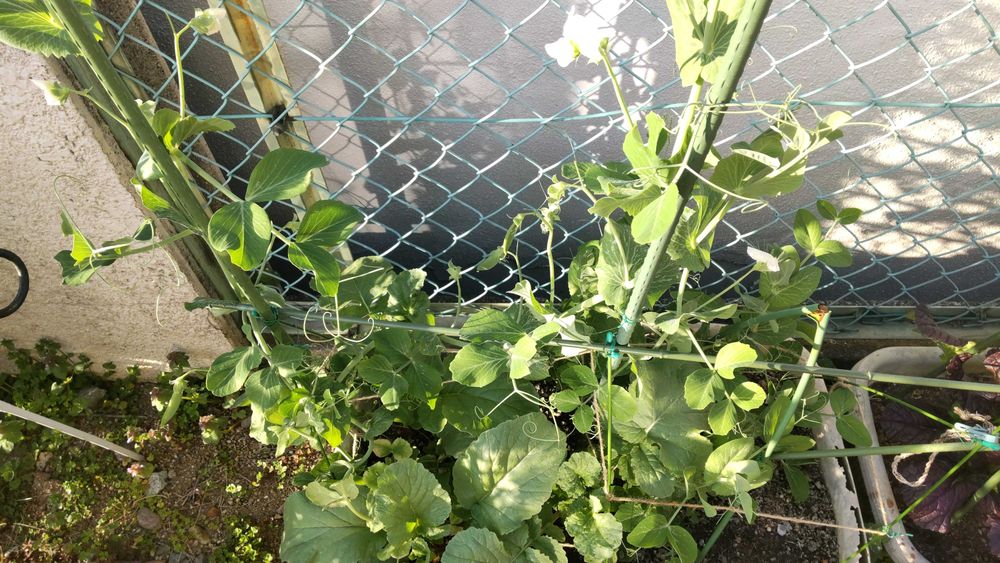 同じプランターのキヌサヤは出遅れ💦地面でうろちょろしてます💦