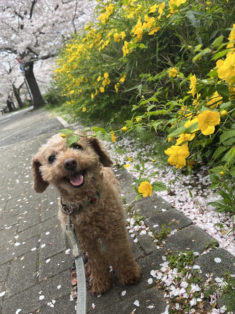 素敵な桜並木があるのね🌸ヤマブキとナッツちゃん可愛い〜〜😍とっても嬉しそうだね🐶🎶🥰💕