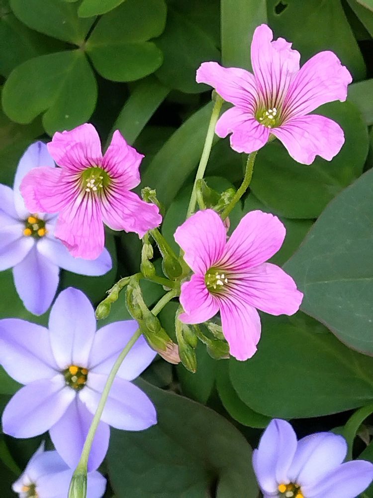 ニラバナの中にピンクのカタバミが可愛らしい