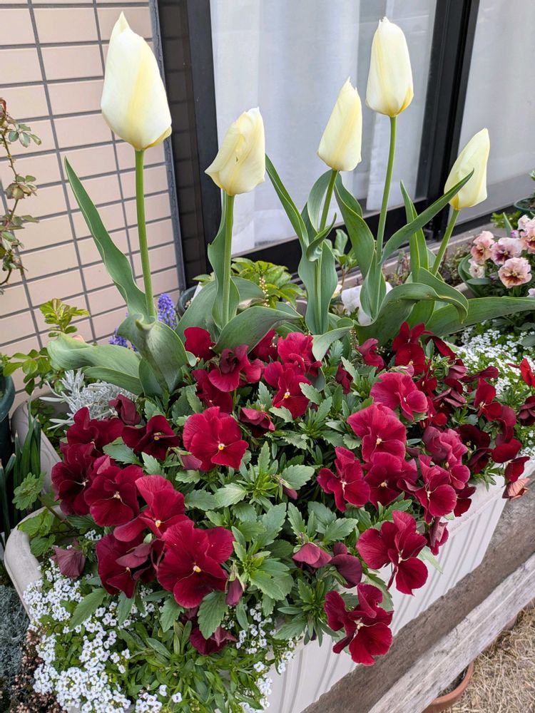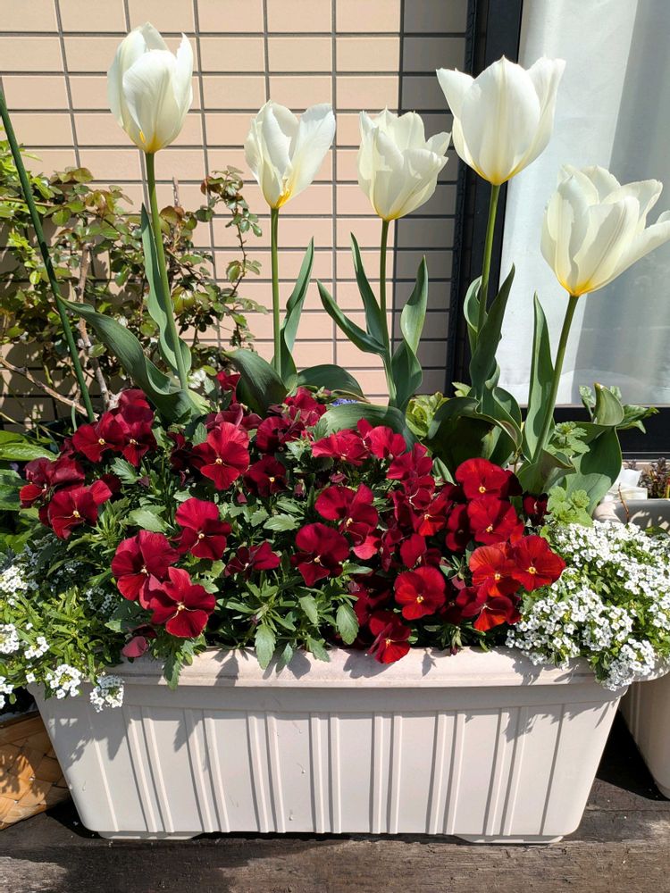 プランターのチューリッププリシマ🤍とよく咲くスミレ❤️が咲きそろいました(*^^*)/