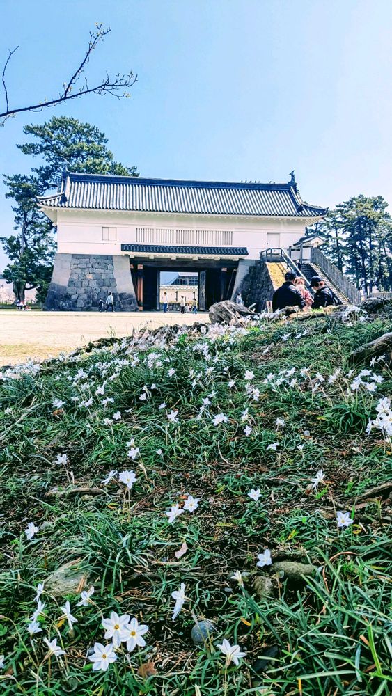 3.4)小田原城址公園の銅門背景にたくさんのハナニラの花が咲いていました