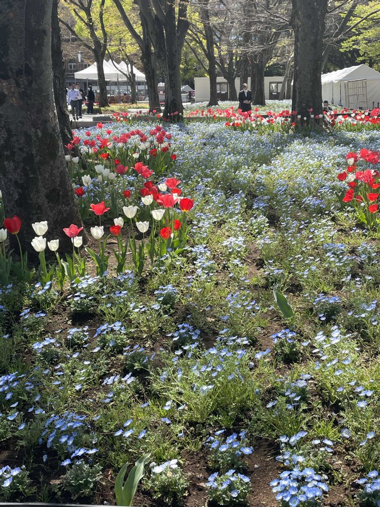花壇はここしか見れなかったけど、大木の周りをぐるっとチューリップが囲み、隙間はネモフィラで埋め尽くされたこの花壇は、かわいいしかない〜💕💕💕