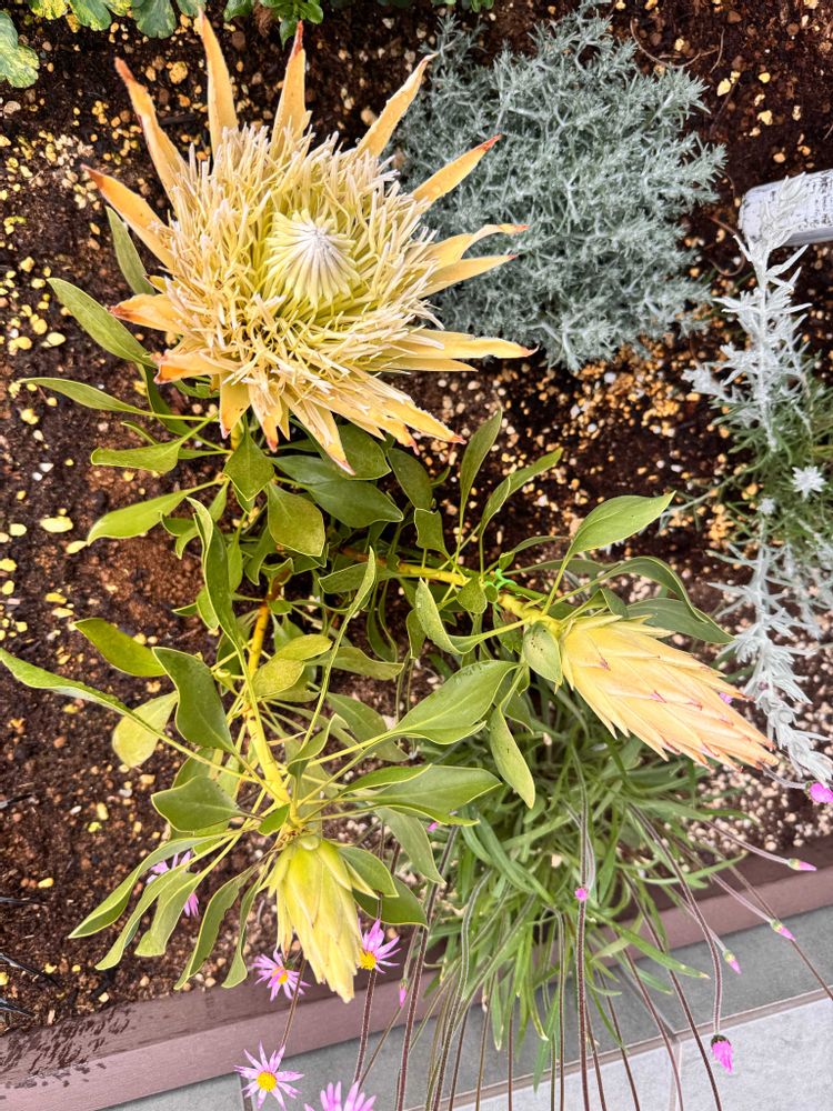 雨が降るとこのプロテアちゃんはギリギリ濡れないです(´∀`)寒風にすこしやられてしまいましたが…