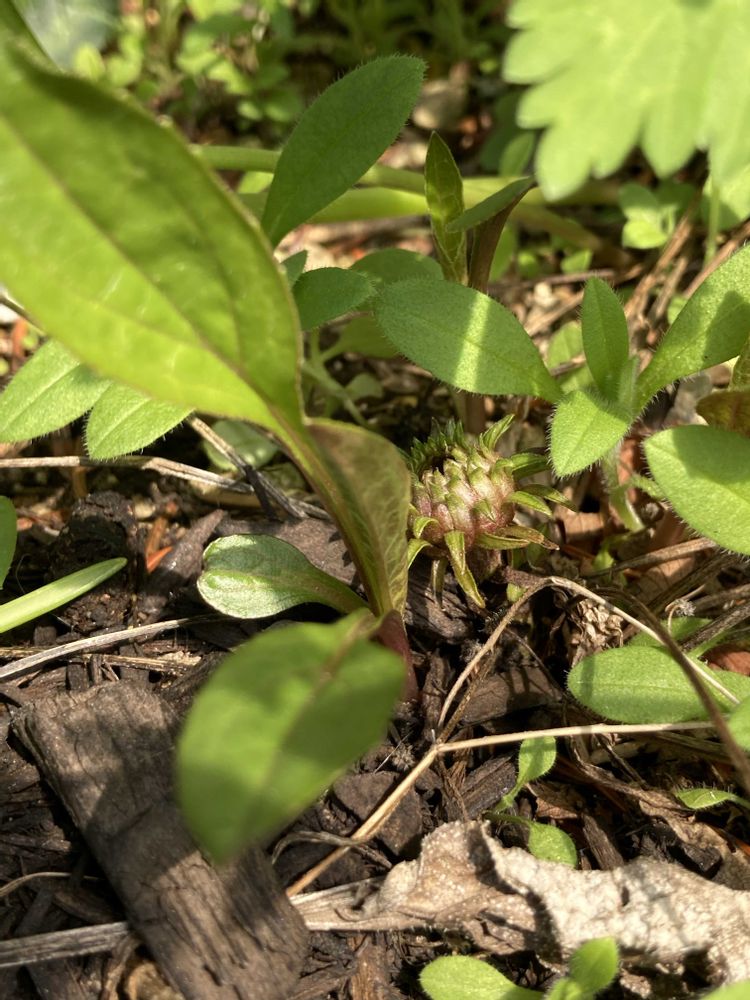 ①②前庭に、?ここにはエキナセア・ブラバドを植えたはず。エキナセアのツボミってこんな感じに上がってくるんだっけ