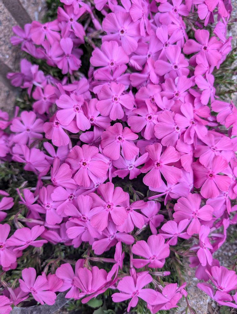 福岡市中央区赤坂の芝桜、近くの小学校のカラスノエンドウ、そして我が家のムラサキカタバミ