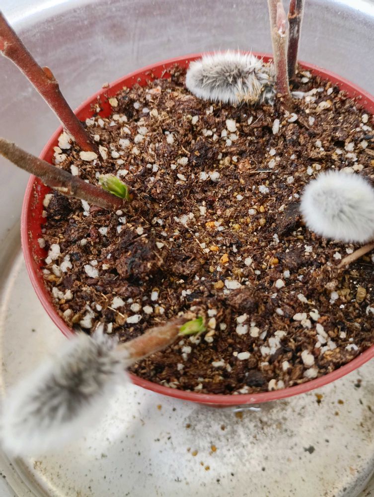 挿し木していたネコヤナギ 新葉が出て来てる 根も出てるかな? もう少し待って 鉢植えか地植えにしよう🙆👍