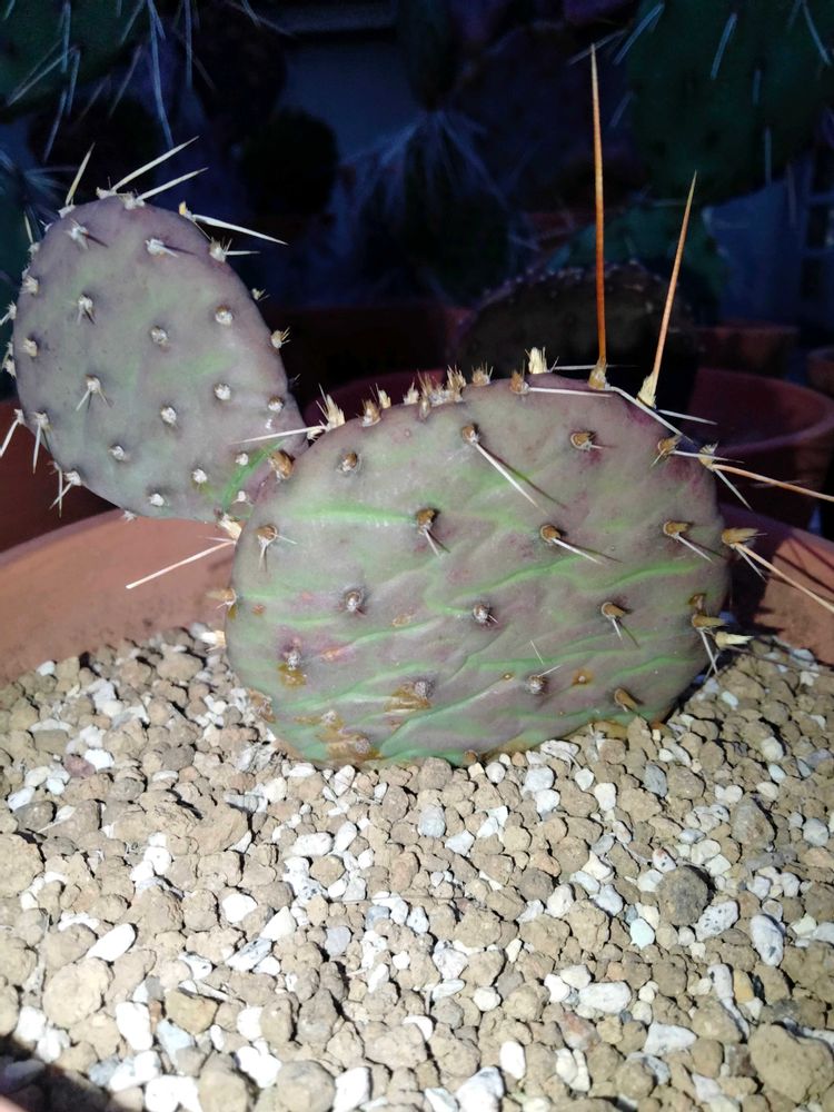 今回初のご紹介となるオプンチアで少し前までダークパープルカラーに紅葉していたのですが春を感じゆっくりと本来のダークグリーンの地肌に戻り始めております。