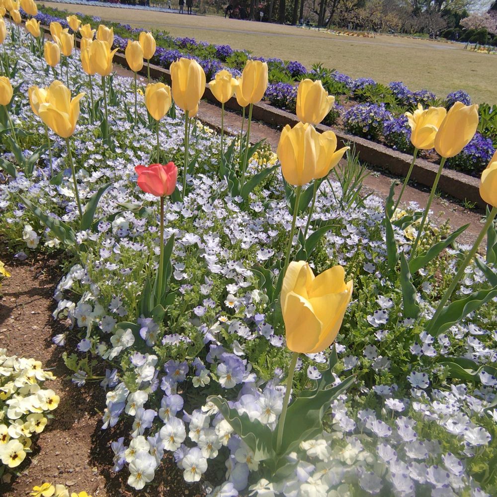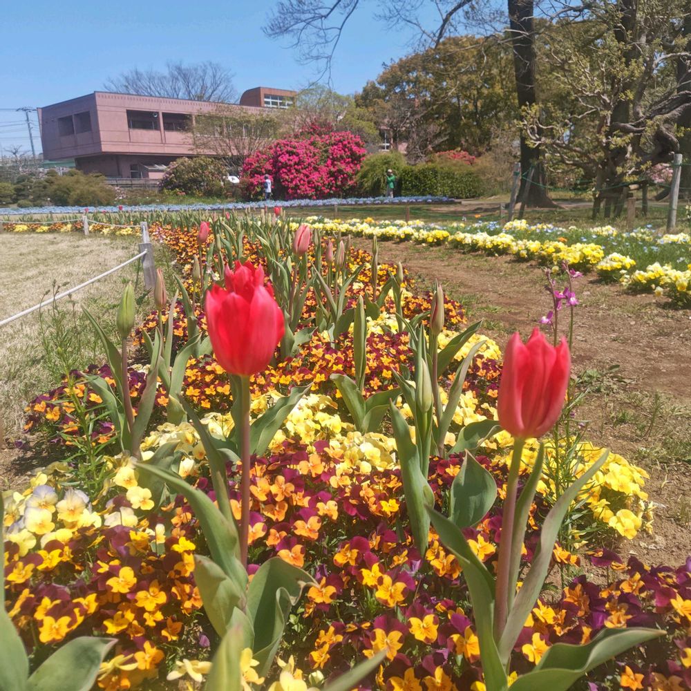 芝生広場の花壇にチューリップが少しずつ咲いてきました🌷🌷🌷