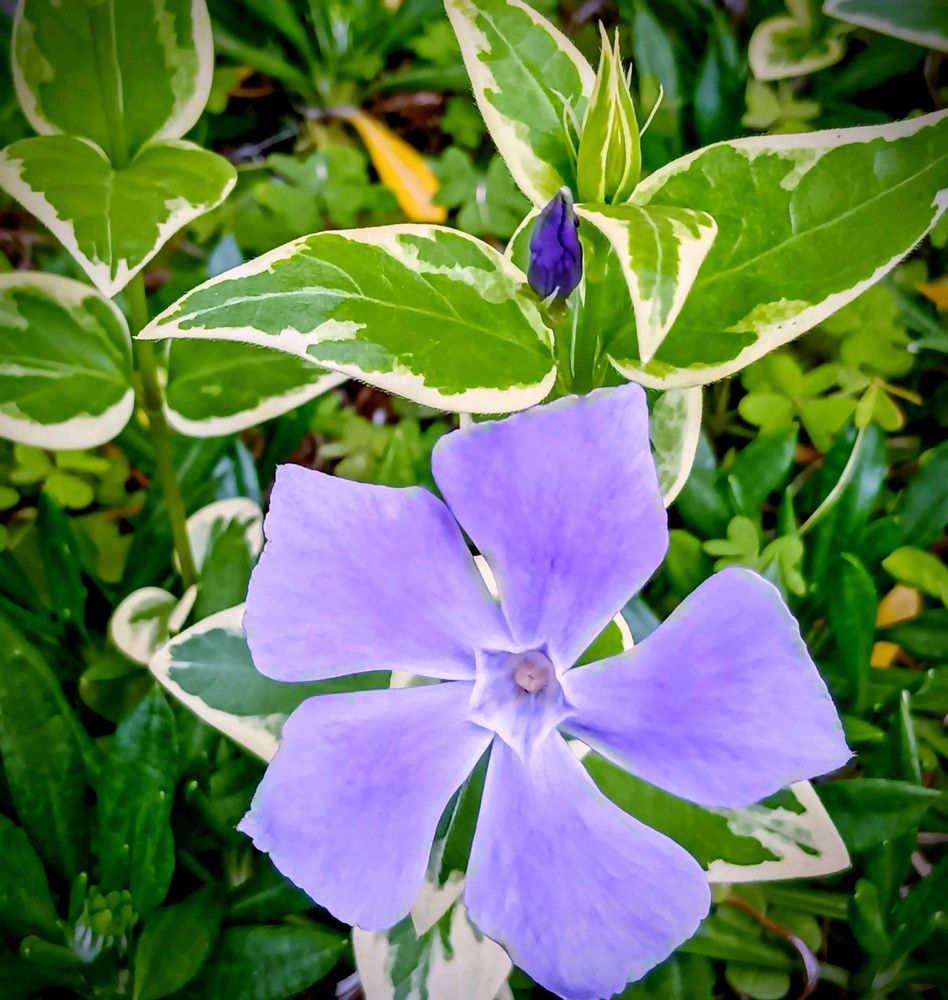 斑入りのツルニチニチソウ、オシャレですね💚🤍💜