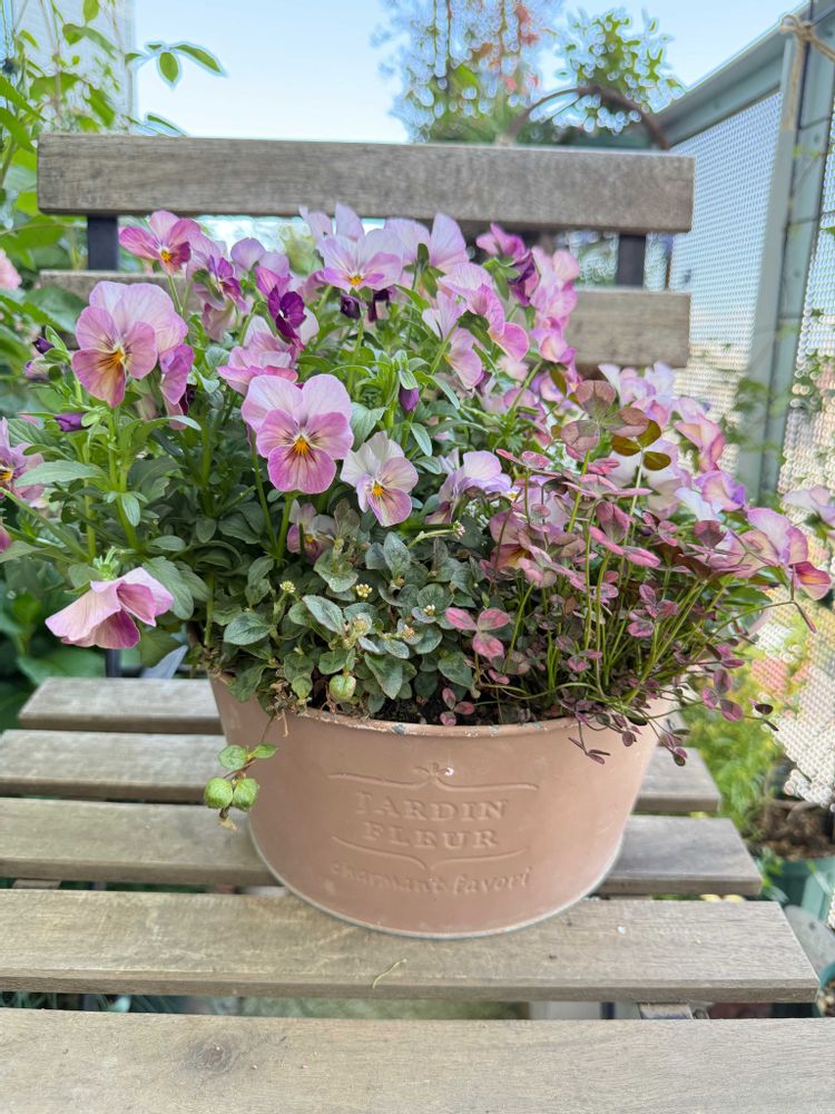 ビオラ2種とクローバー、スィートアリッサムの寄植え、最近モリモリです💓こっそりポリゴナムも入っていますが何処にいるの?って感じです。