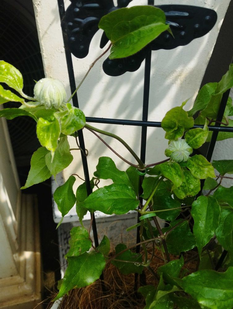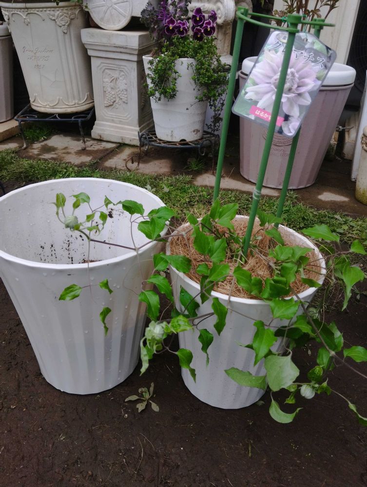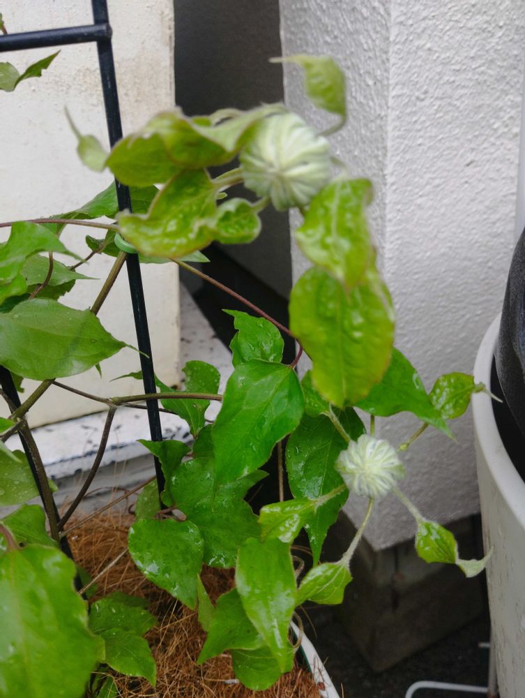 蕾が大きくなって来て枝垂れて来たので、7 号鉢から8号鉢(緑のロングスリット鉢に植えてからポットイン)に鉢増ししてトレリスに絡ませて固定しました。