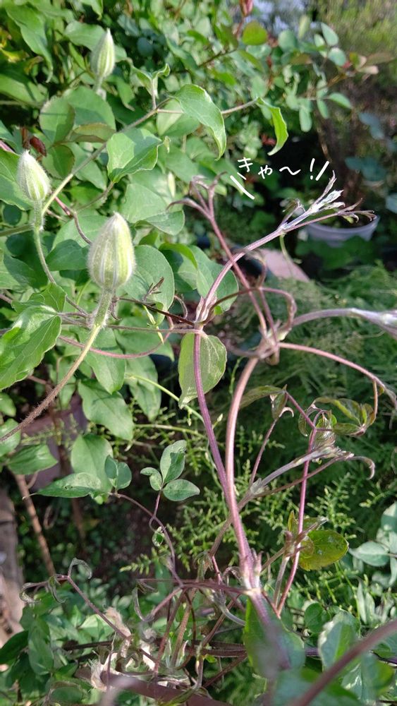 ②クレマチス ドクターラッペルが クレマチス 白万重を掴まえて こっちにおいで~って🤭