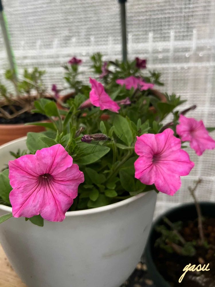 ④ずぶ濡れになってきたのでハウスの冬越しさん…スーパーチュニアビスタシルバーベリーも少し咲き始めてます♪