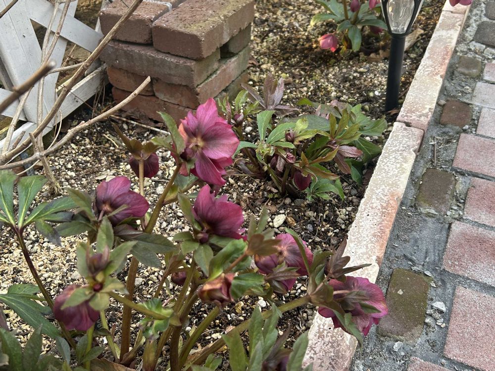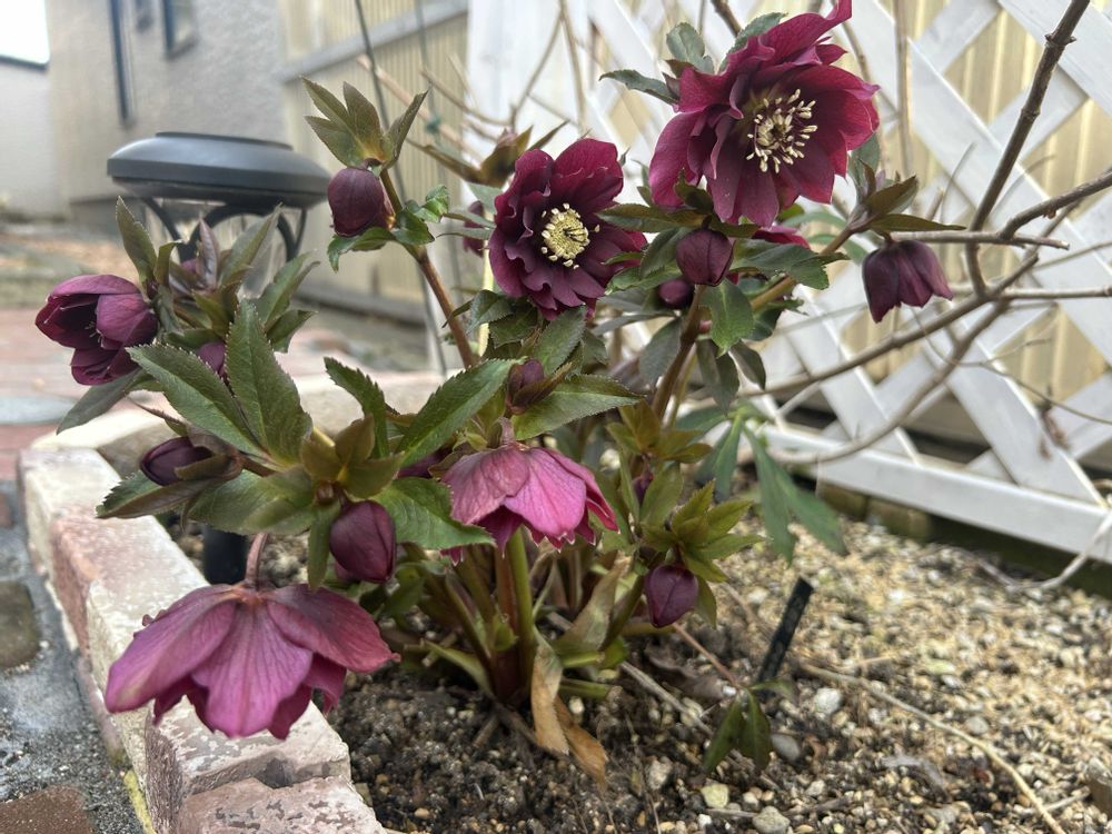 クリスマスローズだいぶ咲いてきました💕3年目のダブルレッドです。暖かい週末が来なくて、冬の始末もまだ終えられてませんが、やっと冬が明けて嬉しい😊
