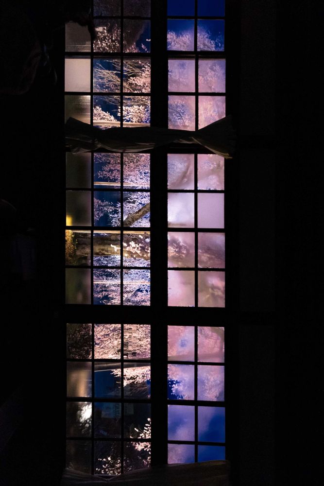 廃校になった古い木造校舎の中からライトアップされた桜を撮らせて頂きました。